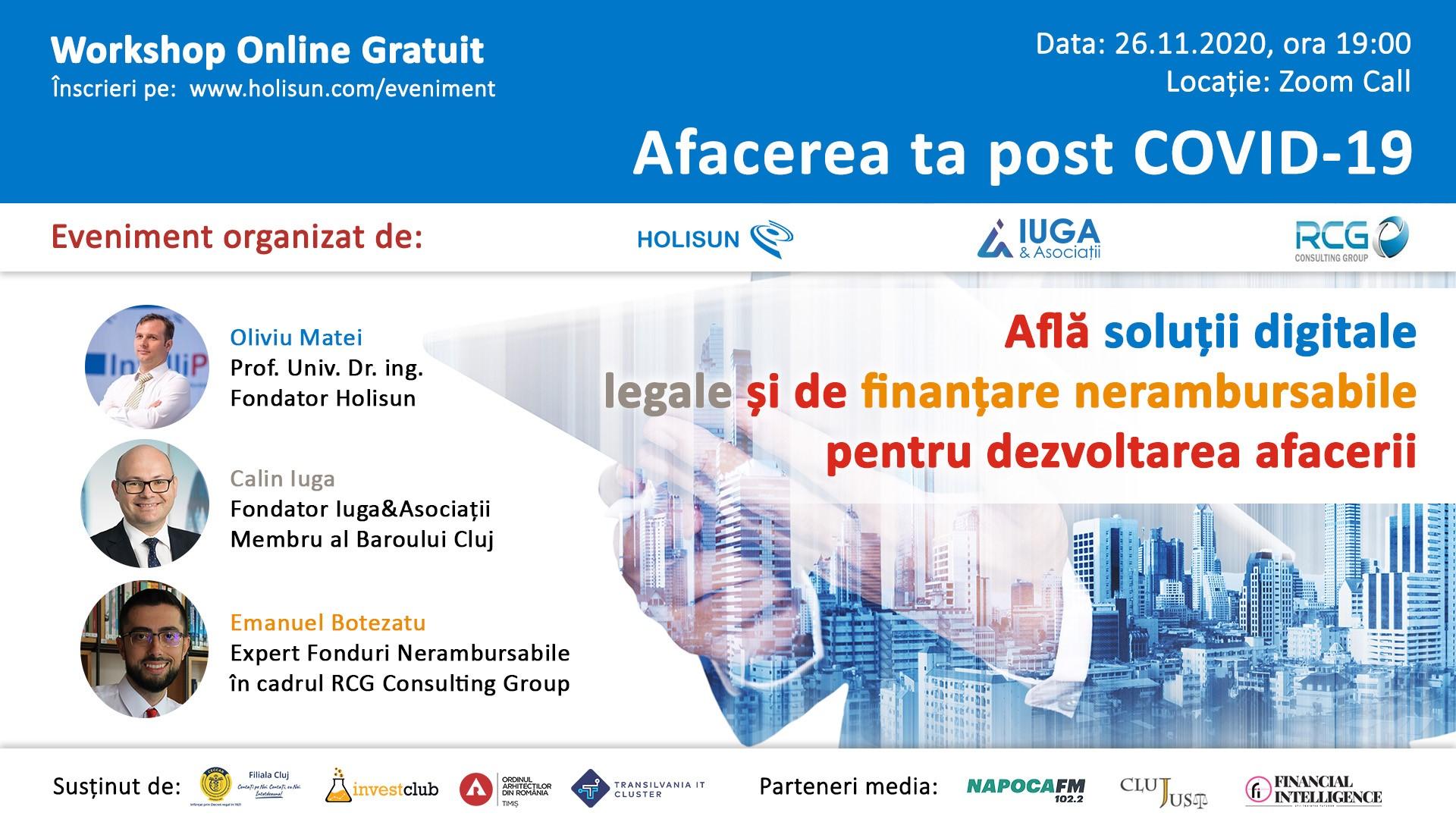 In cadrul workshop-ului “Afacerea ta post COVID-19: Află soluții digitale, legale și de finanțare nerambursabile pentru dezvoltarea afacerii”, desfășurat online, am discuta despre principalele soluții digitale, provocări legale și soluții de finanțare nerambursabilă pentru (r)evoluția afacerii IMM-urilor în acesta perioada provocatoare dar plină de oportunități.
